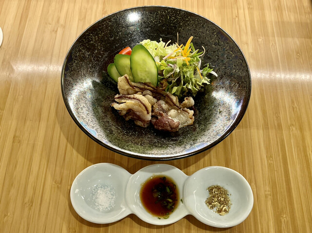 赤紫蘇チューハイに変えて、川魚料理の極みと言える、まじかの油がけ炙り。塩で食べると、淡白なまじかの味が引き立つ。中はレアでこの仕上げはすばらしい。