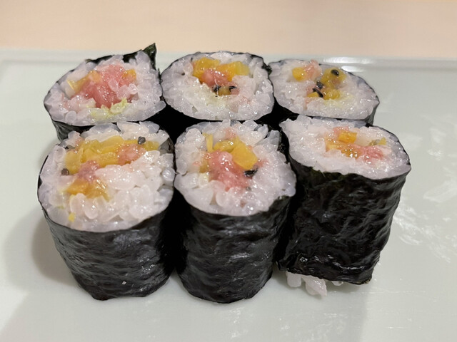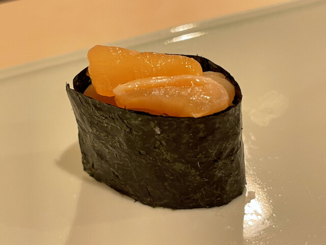 〆は、握り。今日はひも付き赤貝があったので、赤貝と、とろたく巻きを。