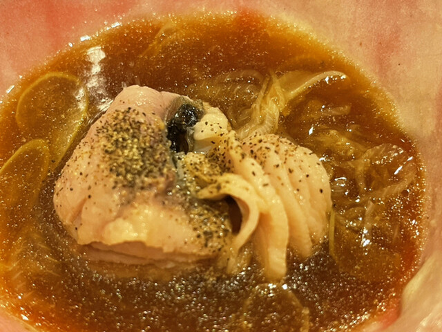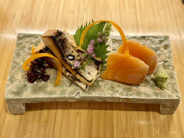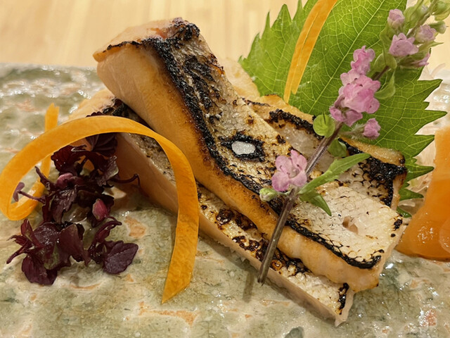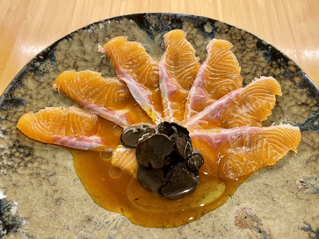 ビワマスは、新作、オイル漬けのトリュフと卵黄まぶし。これがめちゃいい!さらに、ビワマスの肝はレバ刺し風に。もともとおいしい魚だが、これはかなりうまい。