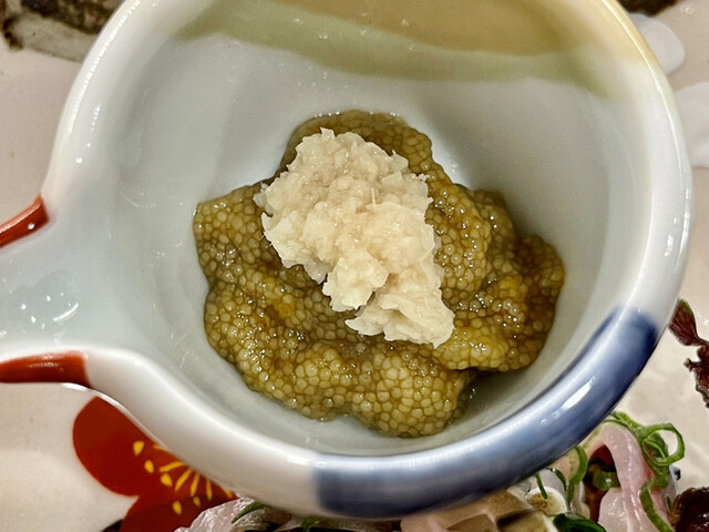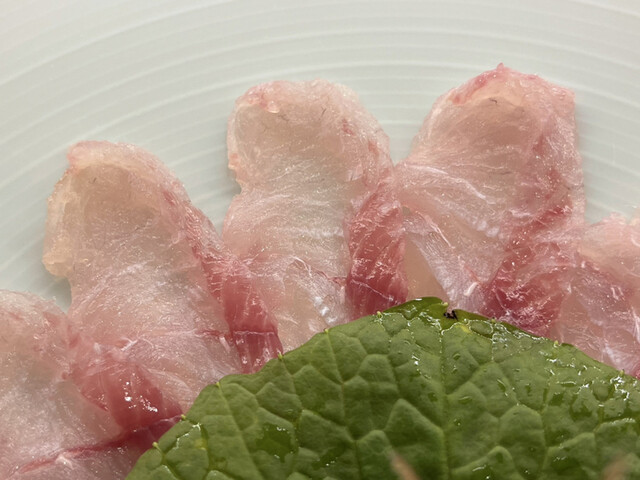 なんとおろしたての岩床鯰。信長葱の青いところで作ったペーストを巻いて口に入れると、めちゃ美味。