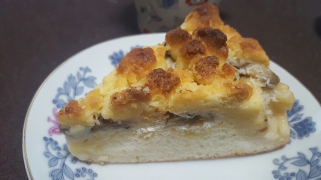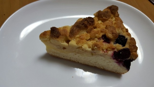 果実のシュトロイゼルはパンとケーキの中間の誰もが好きであろうお味。パン生地の上にシュトラッセル(クッキーそぼろ)をのせ、ラズベリーやすぐりなどの実も一緒に焼いてあります。実は思ったより沢山は入っていないのが残念でしたが、とても美味しいです。