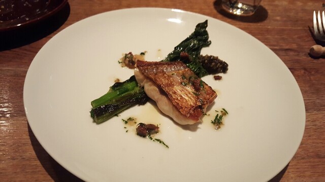 築地より今日のお魚料理ですが、すみません、魚の種類を忘れてしまいました。が、皮はぱりぱり、ソースととてもあっていてすごく美味しかったです。パンなのかなにかわかりませんが、クリスピーなものがお皿にちりばめられていて、これがまたよかった。