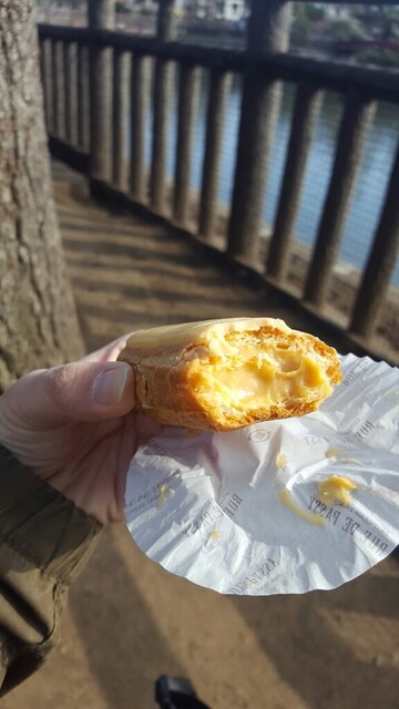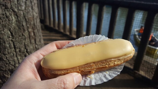 エクレールキャラメルは、ずしりと重く手にとってびっくりしました。中のクリームは半分くらいキャラメルなのではないかと思えるほどのねっとり感と濃さ。一気に血糖値も上昇しますが甘さとキャラメルのほろ苦さが絶妙。あまりのおいしさに失神しそうになりました。