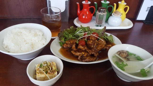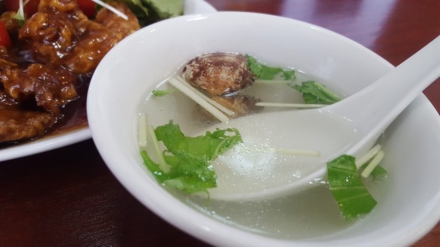 パイコーなんですが、豚肉の薄切りに衣をつけて揚げているので正直非常に薄い印象を受けました。これだったら酢豚のほうが満足度が高いかと思います、こちらの酢豚は美味しいので。付け合わせはサラダ菜。スープは定番のあさりいりのスープでおいしかったです。ご飯は普通かな。