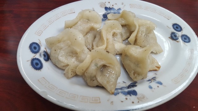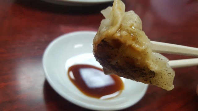 一口餃子は、ニラが効いていてジューシー。本当に一口サイズで、モチモチの皮がこんがり焼けていてこれまた美味しい。