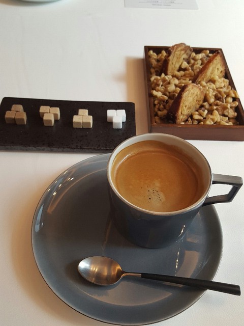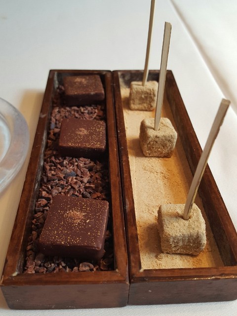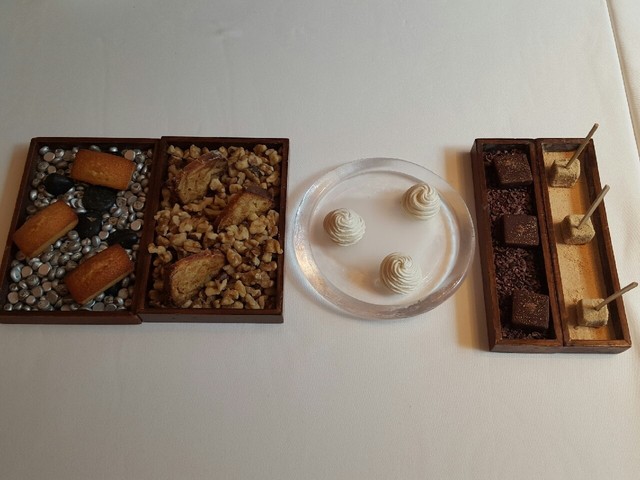 食後のお飲み物と小菓子(わらびもち、チョコレートで包んだバニラアイス、くるみのクグロフ、フィナンシェ、バニラクリームを絞ったメレンゲ)