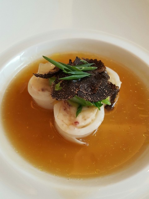 近海釣りヤリイカ 浜名湖のスッポンのファルシ 玉葱のスープ 黒トリュフの香り 九条葱