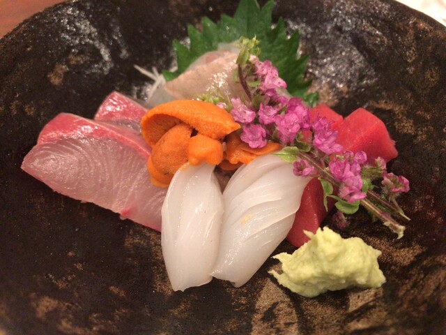 お造りを2種おまかせで盛り合わせていただきました。添えられた春キャベツと新玉ねぎが非常に甘く透き通った味わいで抜かりないです。