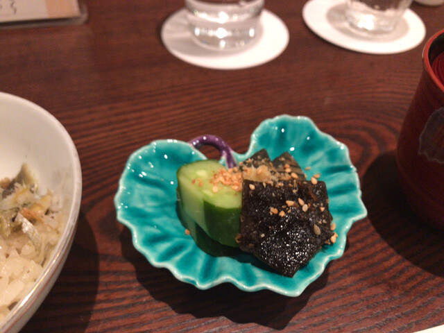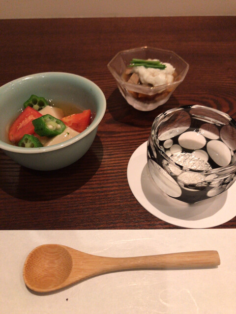 【2015年11月再訪時】先附:(左)大徳寺麩ときゅうり、柿の胡麻和え (右)牡蠣のしぐれ煮。柿の自然な甘さが「秋」って感じ。
