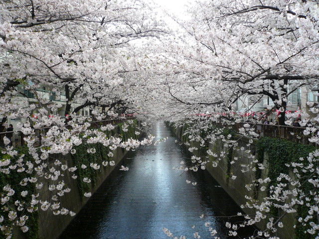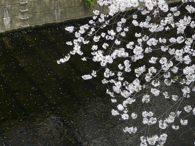 桜の花びらが川に…