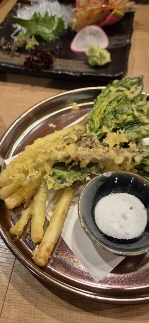 行者ニンニクの天ぷらはほろ苦さの中に甘みがあって、山の力強さがじわっとくる。