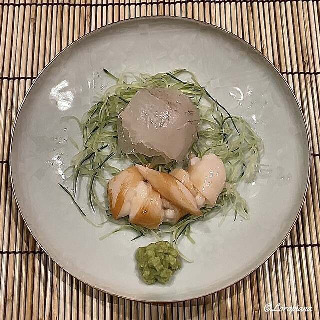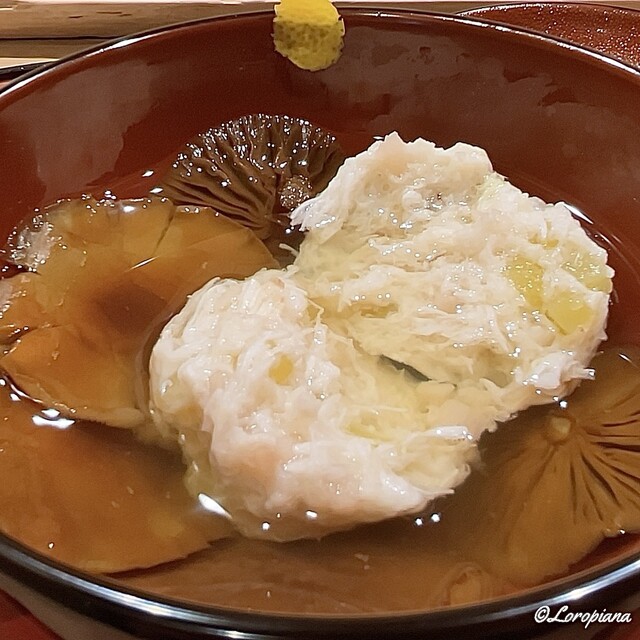青柚で留められた帆立貝柱と木耳と南瓜の真薯