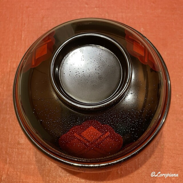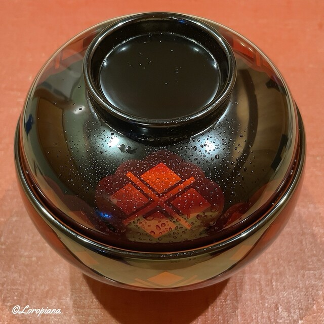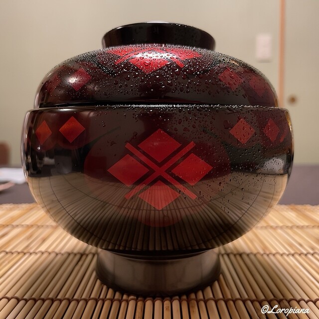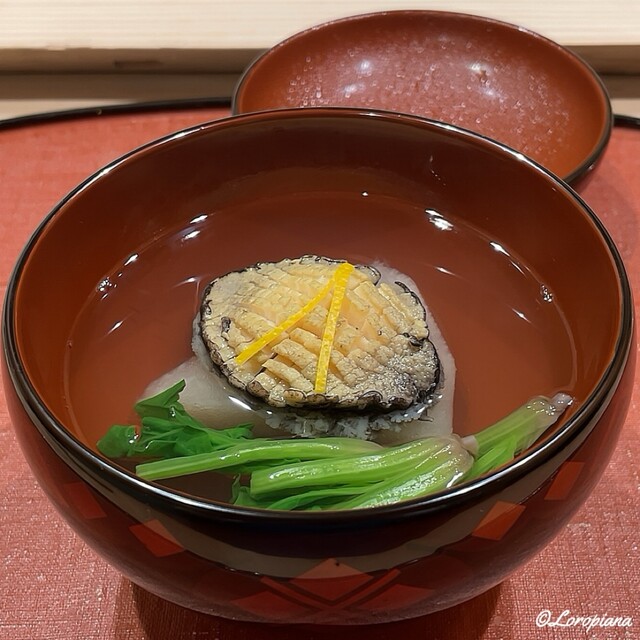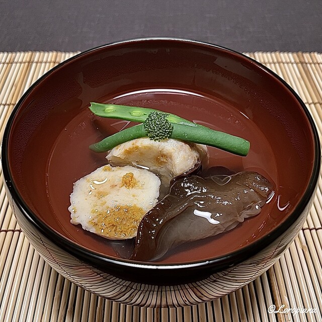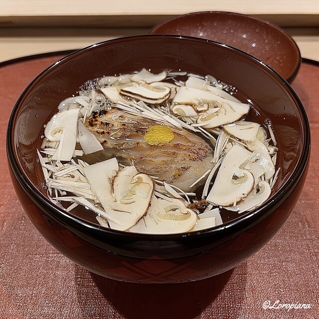 甘鯛の炭火焼に松茸、青柚で留められた帆立貝柱と木耳と南瓜の真薯の椀