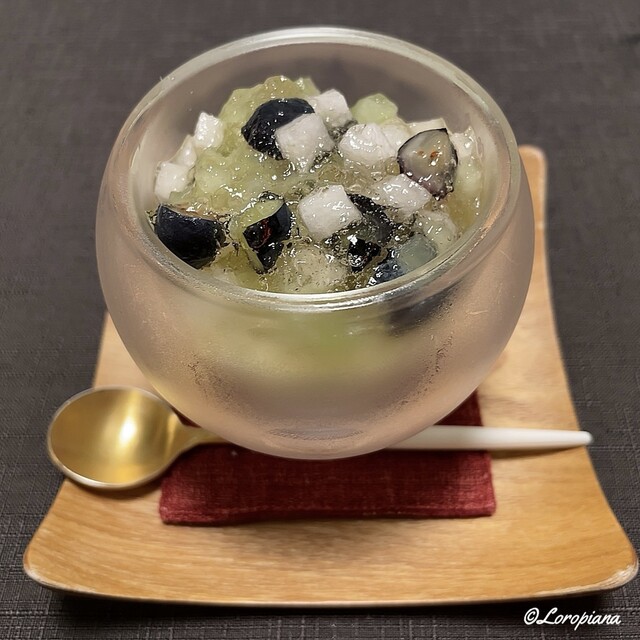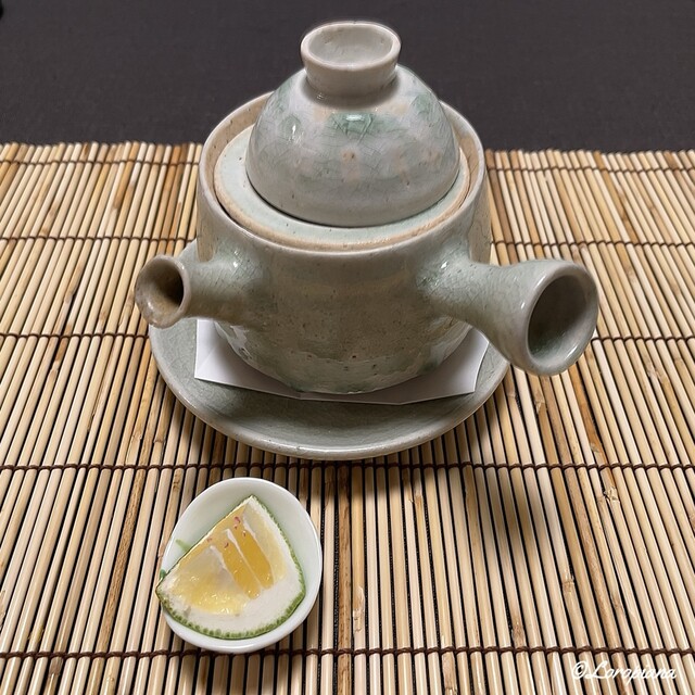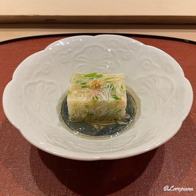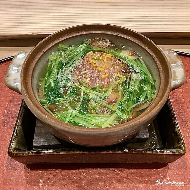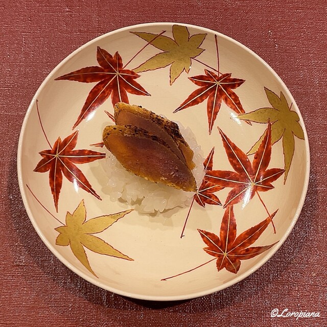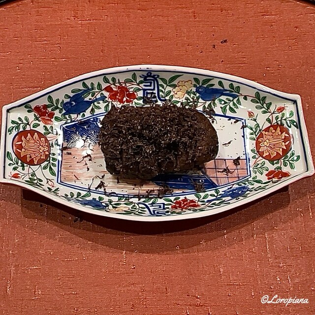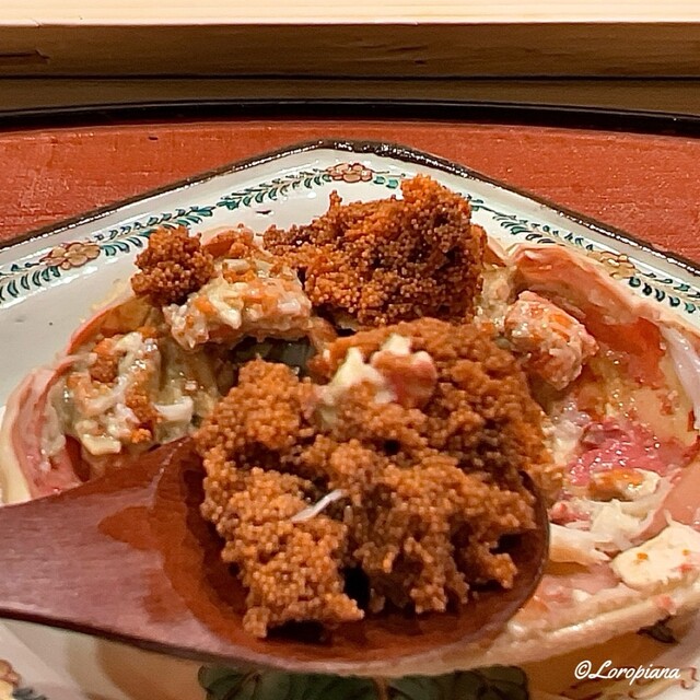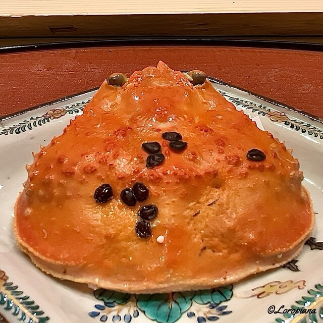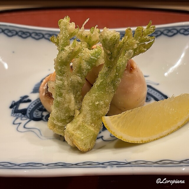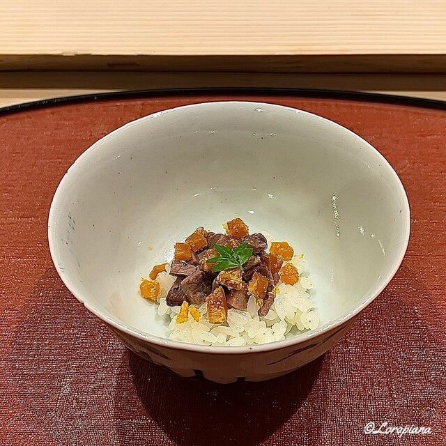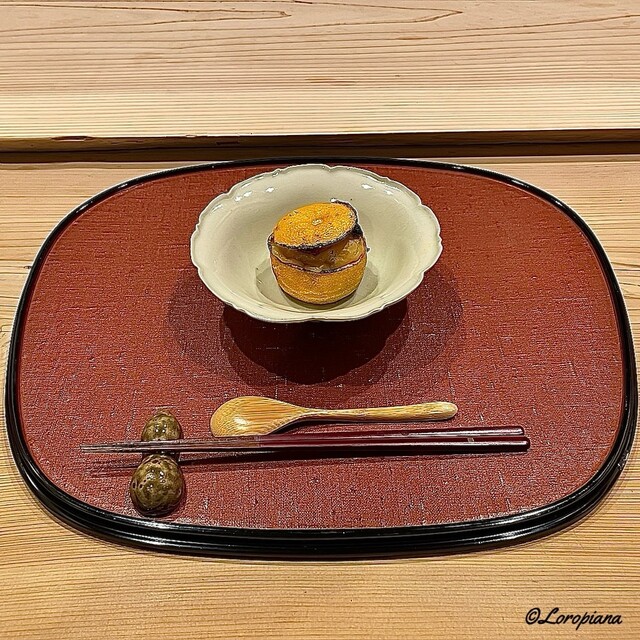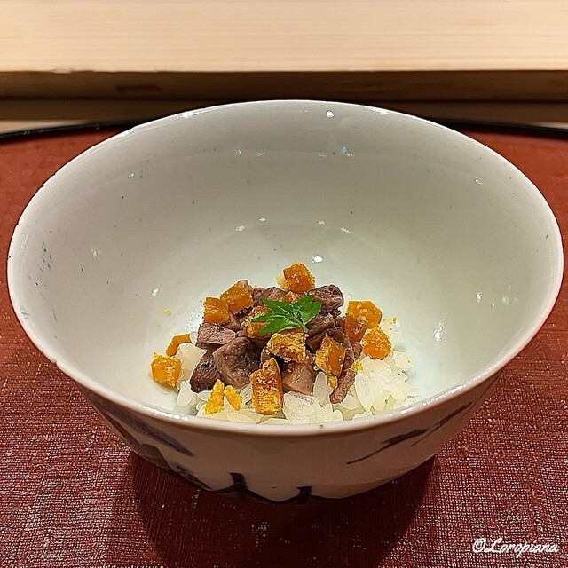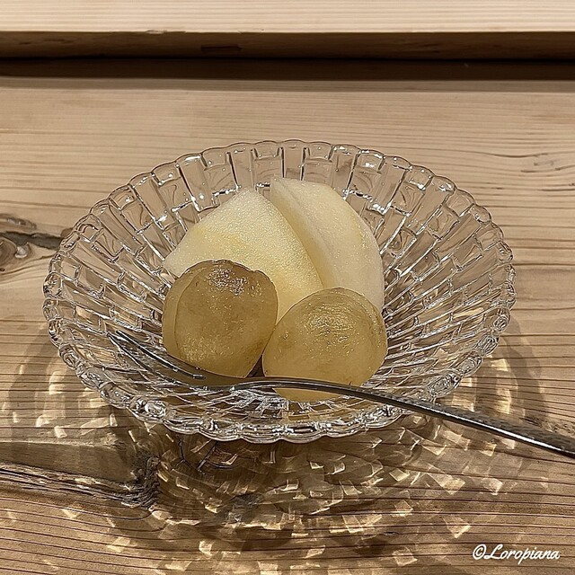 土曜日の夜はGault&Millau(ゴ・エ・ミ・ヨ)やTabelog Award Bronzeに百名店と岩手の日本料理界の牽引役である孤高の料理人 寺沢勇人店主が腕を揮われる『御料理 寺沢』さんへ開店口開けの客として暖簾をくぐり、いつものカウンター席へ。先ずはユキノチカラの無濾過の白ビールで渇いた喉を潤しました。今回も18,000yenのコース料理をいただきました。料理は『薇(ゼンマイ)』に胡瓜(キュウリ)と菊花(キッカ)の胡桃(クルミ)和えの上に針林檎(ハリリンゴ)と花穂紫蘇(ハナホジソ)が盛り付けられた先付から順に懐石料理のコースの順に倣い凌ぎには『赤鯥(ノドグロ)』の炭火焼と『いくら』の塩漬けの飯蒸し(イイムシ)。そして料理人の腕の見せどころの椀物には本枯節(ホンカレブシ)の一番出汁(イチバンダシ)を使った吸い地(スイジ)に『甘鯛(アマダイ)』の炭火焼に岩手県産の『松茸(マッタケ)』、『帆立貝柱(ホタテカイバシラ)』と木耳(キクラゲ)と南瓜(カボチャ)の真薯(シンジョウ)の煮物椀、吸口に青柚(アオユ)。向付には『星鰈(ホシガレイ)』と脂鉢(アブラバチ)とも称される塩竈(シオガマ)ひがしものと呼称されるブランドものの『目鉢鮪(メバチマグロ)』、『太刀魚(タチウオ)』の炙りに『星鰈(ホシガレイ)』の『縁側(エンガワ)』を卸したての山葵(ワサビ)と割醤油(ワリジョウユ)と煎り酒(イリザケ)を使い味わいました。天然物の星鰈(ホジガレイ)は鮃(ヒラメ)や鰈(カレイ)類の魚の中で頂点にたつ高級魚。放血神経締めされた身は噛み込んだ歯を押し返すような弾力と上品な味わいが愉しむことができ縁側(エンガワ)は噛むたびに天然物ならではの脂の旨みが口中に広がりました。美食家として知られる北大路魯山人さえも虜にしたという逸話が残る魚です。揚物には例年この時期の『御料理 寺沢』さんの料理の楽しみの一品でもあるトリュフに勝るとも劣らぬ香り高き『香茸(コウタケ)』と『菱蟹(ヒシガニ)』の剥き身に『鱶鰭(フカヒレ)』を使った春巻(ハルマキ)と大粒でもっちりとした藤九郎銀杏(トウクロウギンナン)の素揚げです。鼻腔(ビコウ)と味蕾(ミライ)を存分に満たしてくれる贅沢過ぎる春巻(ハルマキ)でした。続いて供された冷鉢には『無花果(イチヂク)』の胡麻酢(ゴマス)掛けで油物を食べた口内を一度リセットさせコース料理の華でもある八寸代わりの旬菜盛合せが供されました。その内容は『海鞘(ホヤ)』の檸檬塩(レモンジオ)の塩辛(シオカラ)、薫香を纏わせた『蛸(タコ)』の柔らか煮、豆腐(トウフ)の酒盗(シュトウ)味噌漬(ミソヅケ)、薩摩芋(サツマイモ)の蜜煮(ミツニ)、『秋刀魚(サンマ)』のクミン風味の有馬煮(アリマニ)、『螺貝(ツブガイ)』の黒胡椒煮(クロコショウニ)、『梭子魚(カマス)』焼と焼いた天然ものの『舞茸(マイタケ)』、伏見唐辛子(フシミトウガラシ)に『月の輪熊(ツキノワグマ)』の肉団子(ニクダンゴ)という酒を呼ぶ酒肴の数々、そして食事前には土瓶蒸し(ドビンムシ)が供されました。その中身は岩手県産の『松茸(マッタケ)』に『鮎魚女(アイナメ)』、山菜で御當地では『みずの実』と呼ばれるウワバミソウの瘤に日本一の里芋とも称される御當地 北上産の二子里芋(フタゴサトイモ)。〆の食事は天然物の『舞茸(マイタケ)』と『香り豆(カオリマメ)』と『ホロホロ鳥』のそぼろの炊き込みごはんを留め椀の味噌汁と香の物とともに味わい水菓子には『洋梨(ヨウナシ)』のコンポートと柿(カキ)と北上産の『桑茶(クワチャ)』の羊羹(ヨウカン)にて長月の寺沢劇場の料理はひと通りとなりました。