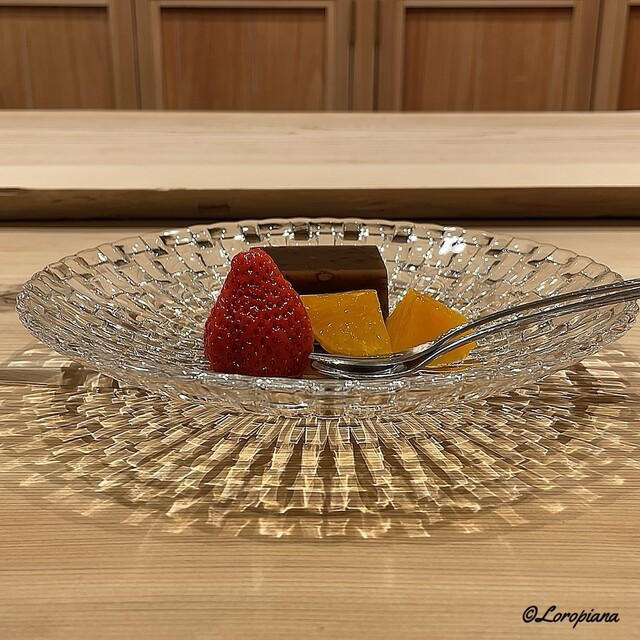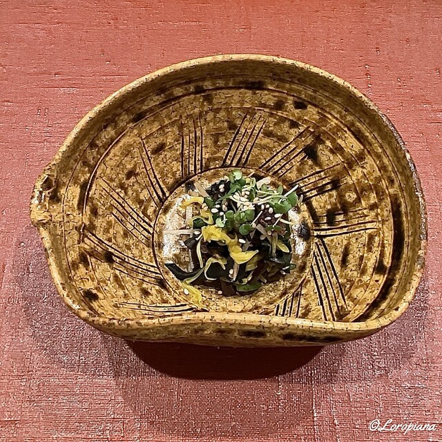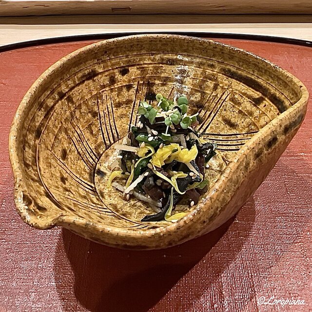 土曜日の夜は岩手の日本料理界の牽引役である孤高の料理人 寺沢勇人店主が腕を揮われる『御料理 寺沢』さんへ定期再訪させていただきました。午後6時の開店口開けの客として訪れいつものカウンター席に席を取らせていただき大好きだった銀河高原ビールのDNAを継承したユキノチカラの無濾過の白ビールで渇いた喉を潤しました。今回も18,000yenのコース料理をいただきました。先付には『生海胆(ナマウニ)』が表面を飾り蚕豆(ソラマメ)のすり流し、そして帆立貝柱(ホタテカイバシラ)の出汁(ダシ)を使った『毛蟹(ケガニ)』の玉地〆の先付からスタート。料理に合せて『紀土』純米大吟醸 夏ノ疾風を所望。懐石料理のコースの順に倣い凌ぎには備長炭で焼かれた『鰻(ウナギ)』の白焼(シラヤキ)と大和芋(ヤマトイモ)の鰻(ウナ)とろの飯蒸し(イイムシ)の小丼。そして料理人の腕の見せどころの椀物には本枯節(ホンカレブシ)の一番出汁(イチバンダシ)の吸い地(スイジ)に三陸産の立派な大きさの『蝦夷鮑(エゾアワビ)』に湯葉真薯(ユバシンジョウ)に陸蓮根(オクラ)の椀物。吸い口に青柚(アオユ)。存在感のある『あわび』が白眉。その三陸産の鮑(アワビ)を現在は盛岡で醸されていますが元々は三陸の蔵で醸されていたAkabuの『浜娘』 岩手限定蔵出純米酒で受止めました。向付は三陸産の釣りものの『石鯛(イシダイ)』が主役で塩竈産の本鮪(ホンマグロ)の幼魚の『めじ鮪(マグロ)』の中トロと北海道産の『螺貝(ツブガイ)』が露払いと太刀持ちを担っていました。横綱の『石鯛(イシダイ)』の活かった身質、噛み込んだ歯を押し返す弾力。割醤油(ワリジョウユ)と煎り酒(イリザケ)を使い分け。今回は山葵(ワサビ)は敢えて付けずに三種類のスプラウトで味わうというサラダ感覚で味わう次世代に向けての新しい寺沢スタイルで味わいました。この向付には『吾妻嶺』純米吟醸 美山錦 無濾過 生原酒 初搾りとともに味わいました。焼物には美味さ⭐️⭐️⭐️⭐️⭐️ (イツツボシ)と言われる岩手県産の黒毛和牛の最高峰『いわて牛』の薇(ゼンマイ)包み巻。実山椒(ミザンショウ)と蕪焼(カブラヤキ)が添えられ供されての登場で。脂の甘みが薇(ゼンマイ)に染み渡ります。いつもであれば西蕨(ニシワラビ)というブランド蕨(ワラビ)を使われる寺沢店主ですが薇(ゼンマイ)は自分の記憶では初かと。箸休めに供された酢の物には喉越しの良い『蓴菜(ジュンサイ)』、コース料理の華である八寸代わりの旬菜の盛合せには微塵切りの蛸(タコ)と馬鈴薯(ジャガモ)のコロッケ、太刀魚(タチウオ)の炭火焼、喉元過ぎた後に甘みが後追いしてくる海のパイナップルとも称される海鞘(ホヤ)に無花果(イチジク)の胡麻(コ゚マ)掛け、薑(ハジカミ)に陸鹿尾菜(オカワカメ)、青梅(アオウメ)の蜜煮(ミツニ)に隠元(インゲン)の黄身酢(キミス)和え。強肴には太平洋の赤いダイヤモンドの異名を持つ『喜知次(キチジ)』に丸茄子(マルナス)に蕃茄(トマト)を冷たいトマト出汁で味わう煮浸し、〆の食事には食鶏の女王と称される『ホロホロ鳥』と『西蕨(ニシワラビ)』というブランドものの蕨(ワラビ)の炊き込みごはん。水菓子には北上産の桑の葉(クワノハ)の冷たい羊羹(ヨウカン)そして桑の葉(クワノハ)茶にてひと通りとなりました。食べ切れぬ炊込みごはんはオミヤにしていただき翌日の日曜日の夜に美味しくいただきました。
