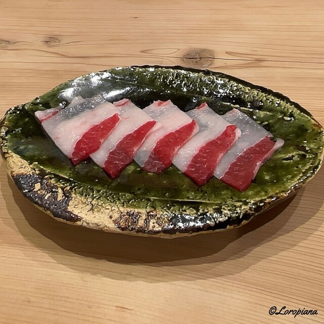 石鯛、めじ鮪の中トロ、螺貝の造りを割醤油と煎り酒で