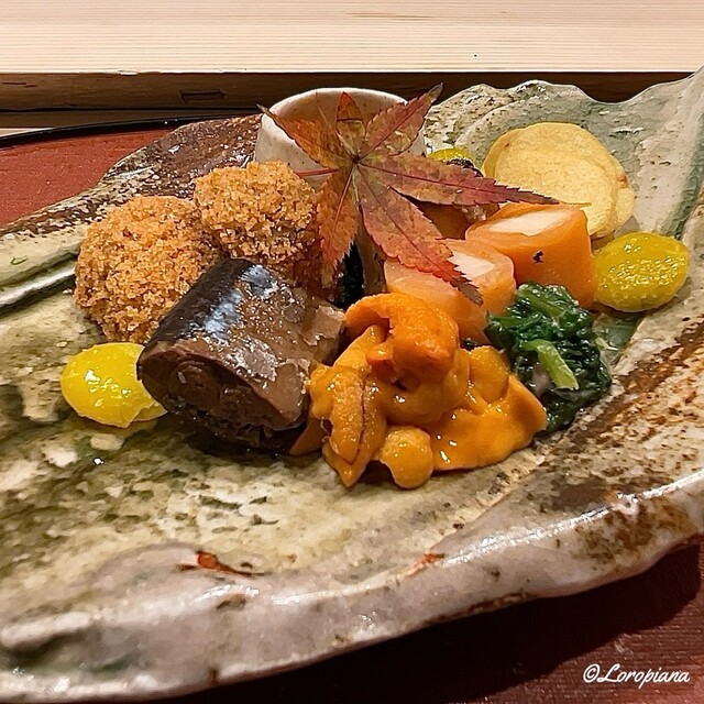 焼栗、アボガド味噌漬、秋刀魚甘露煮、銀鱈西京味噌漬、茸と蟒蛇草の天ぷら、眞子鰈の縁側のキャビア和えに鮑の柔らか煮