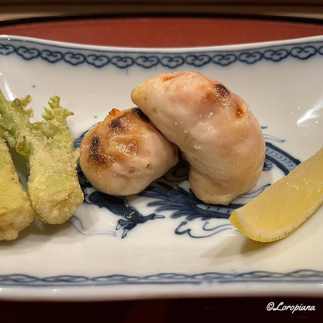 のどぐろの炭火焼といくらの塩漬けの飯蒸し
