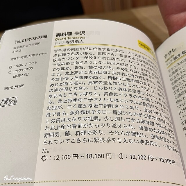 仕事を定時で切り上げ各駅停車の東北新幹線やまびこ号に飛び乗り目指したのは盛岡から2駅19分の北上です。そして向かった先は北上駅西口から徒歩12〜13分の位置に店を構えられTabelog日本料理部門の百名店に名を連ねTabelogAward 5年連続受賞店でもある寺沢勇人店主が孤軍奮闘腕を揮われる岩手を代表する日本料理店『御料理 寺沢』さんです。席をいつものカウンター席に取らせていただき先ずは爽やかさと程良い酸味のホワイトエールを愉しめるユキノチカラ白ビールで渇いた喉を潤し神無月の料理は針茗荷(ハリミョウガ)で覆われたトリュフに勝るよりも香り強い香茸(コウタケ)に人形茸(ニンギョウタケ)に柿(カキ)に胡瓜(キュウリ)に菊花(キッカ)に胡麻(ゴマ)に松の実(マツノミ)の御浸し(オヒタシ)の前菜からスタート。そして凌ぎには三陸大船渡産に揚がった真鯖(マサバ)ではなく稀に見るサイズが大きく鮮度が高いというゴマ鯖(サバ)で造られた身厚の鯖(サバ)の棒ずし、椀物には特注で造ってもらったという平泉の奥州藤原家に由来の或る秀衡塗、その中には松茸(マッタケ)と備長炭で香ばしく焼かれた甘鯛(アマダイ)、甘鯛(アマダイ)の上にへぎ柚子(ユズ)の吸口、鰹(カツオ)の枯節(カレブシ)の一番出汁を使った旨味が五臓六腑に染み渡る吸い地、向付は多皿で前半には三陸大船渡産産の眞子鰈(マコガレイ)と間八(カンパチ)、後半には宮城塩竃産の脂が良い感じに乗り旨みのある塩竃ひがしものとも称されるブランドのメバチ鮪(マグロ)の中トロの二段構えで割醤油とちり酢を使い分け味わいます。焼物には北上産の鹿肉(シカニク)のフィレ肉の備長炭焼に焼松茸(ヤキマッタケ)添え。箸休めには天然あみ茸に霙卸し(ミゾレオロシ)といくらを味わいコース料理の花でもある八寸代わりの旬菜盛合せには焼栗(ヤキグリ)にアボガドの味噌漬、大きな秋刀魚(サンマ)甘露煮、銀鱈(ギンダラ)の西京味噌漬に茸(キノコ)の天ぷらと蟒蛇草(ウワバミソウ)の天ぷら、小鉢の中には眞子鰈(マコガレイ)の縁側(エンガワ)と切り身のキャビア和えに丸々一個使った鮑(アワビ)の柔らか煮、蒸し物代わりの留め椀として供された土瓶蒸しには王道の松茸の土瓶蒸し。〆の食事には松茸ごはん、そして梨と葡萄とブルマンジェの水菓子を茶といただきひととおりです。