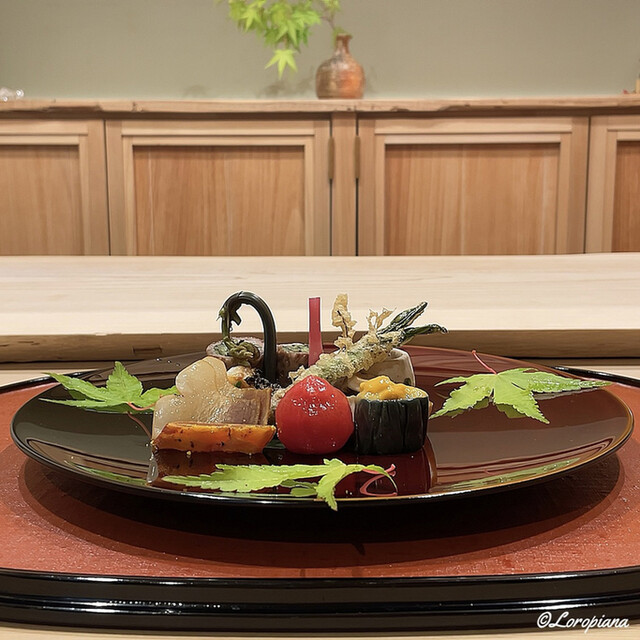 北上牛のフィレ肉と蕨の八幡巻、鱸の木の芽焼、自家製の鯨ベーコンに唐墨の炙り、行者大蒜薄衣揚げ、チェリートマトの蜜煮、海鼠酢、鮑の柔らか煮、茄子の揚げ浸しの生海胆載せ