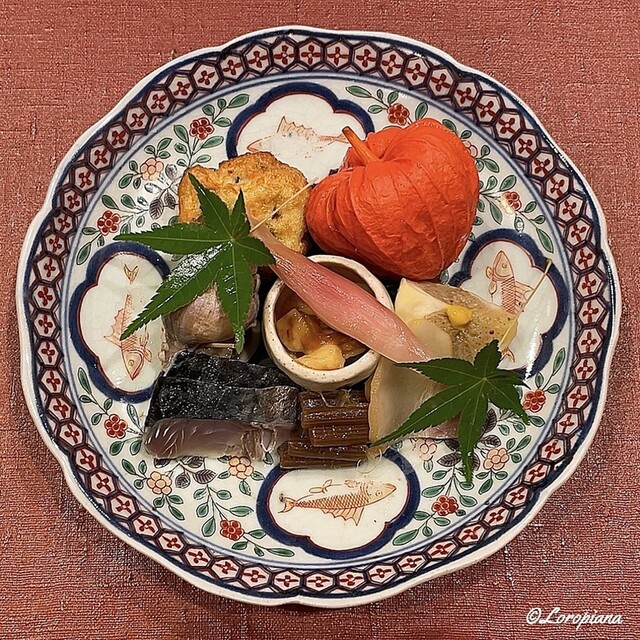 薩摩揚、磯螺貝の旨煮、鯖に酢取り茗荷、海鞘、伽羅蕗に酸漿、酸漿の中には穴子の蕃茄煮、自家製の鯨ベーコンに無花果