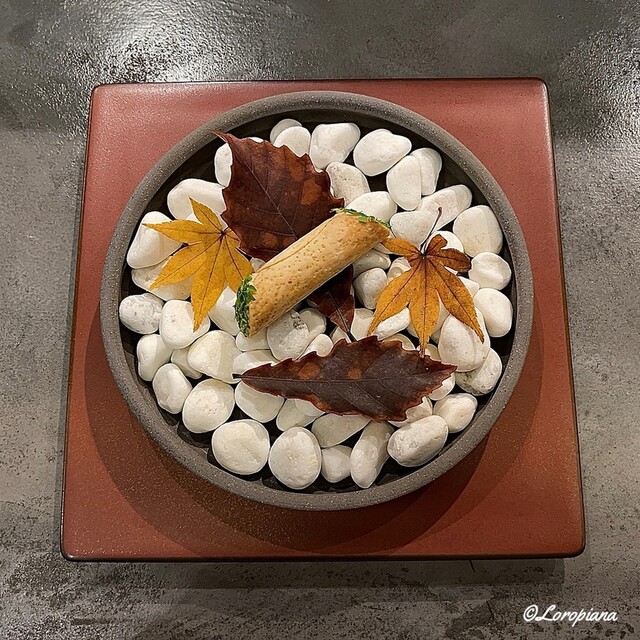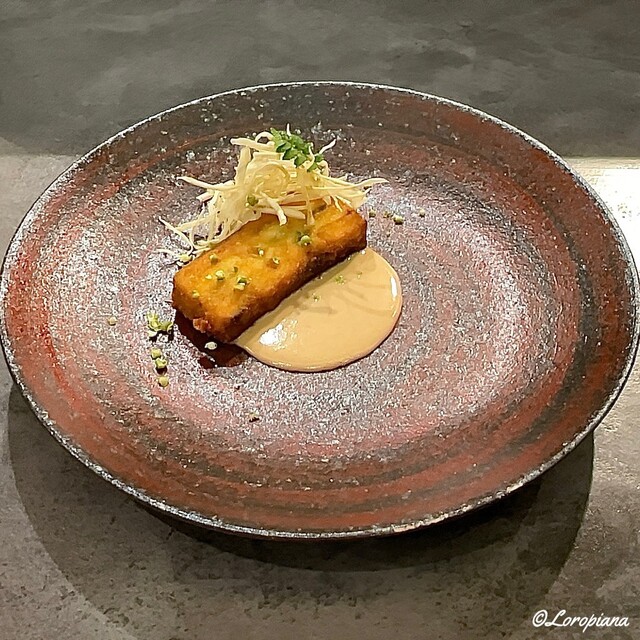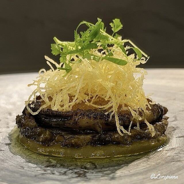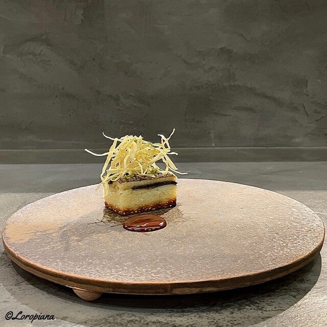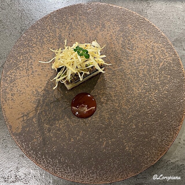 穴子のインパデッラと牛蒡のコンフィと牛蒡のチップスと自家製の実山椒