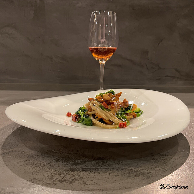 Vie di Romans Dessimis Pinot Grigioとシャモロックと香茸のサルシッチャ