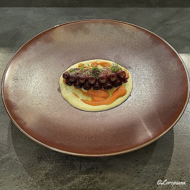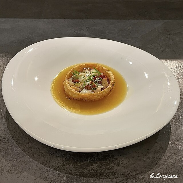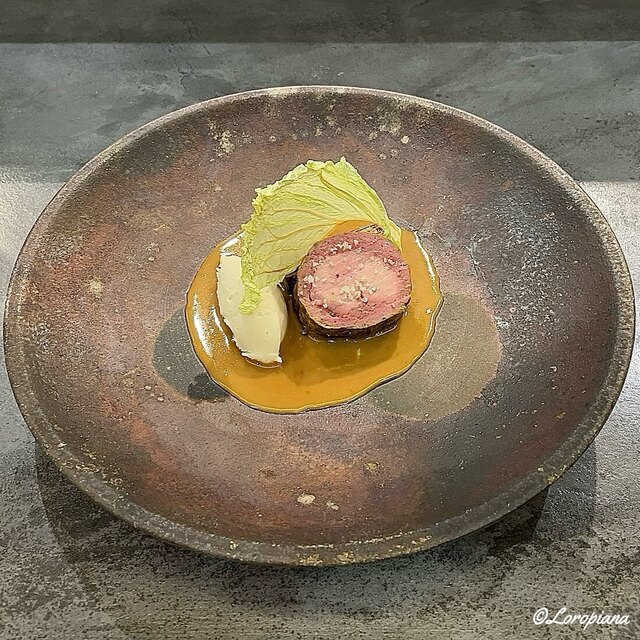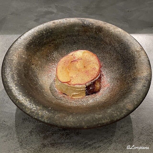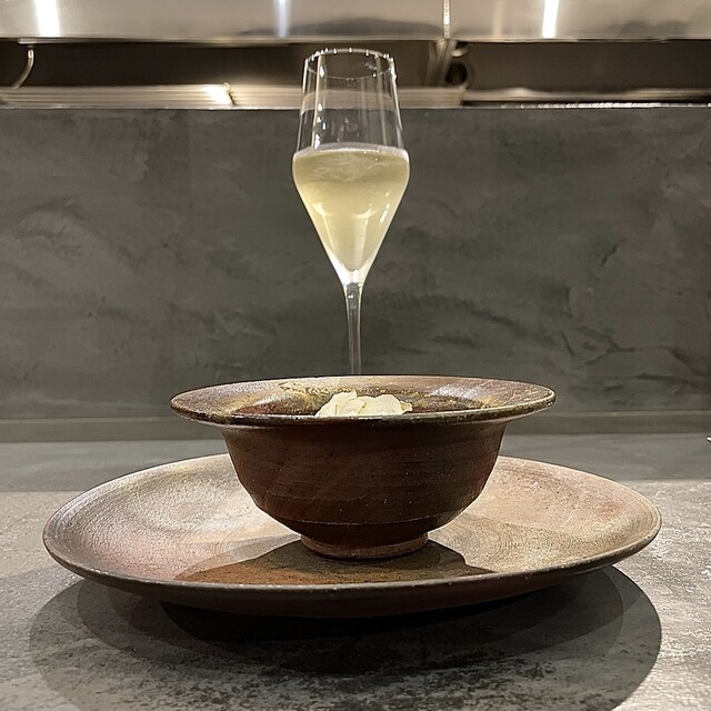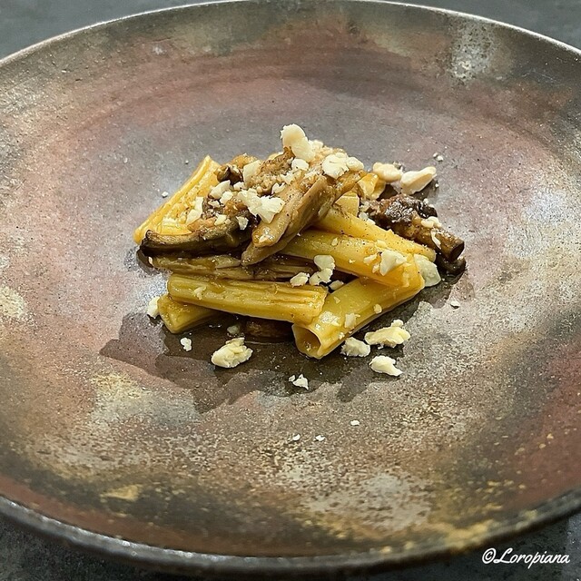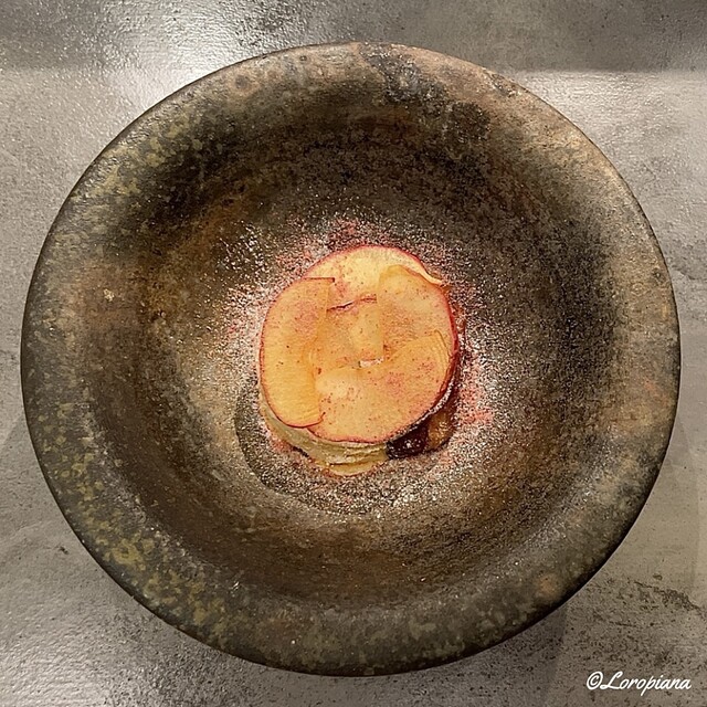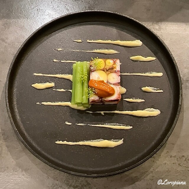 待ちに待った週末の土曜日の昼下がりは東北新幹線はやぶさ号に乗込み向かった先は青森県の玄関口の八戸です。八戸駅到着後に市営バスに乗換えバスに揺られること30分余で宿泊先のホテルへチェックイン。夕方の開店時間に合わせて逆算し市営バスに再び乗込み15分程先の平和病院前で下車。そこから徒歩2~3分程にてTabelog Award Bronze賞やイタリアン百名店をはじめとしてGault & Millau(ゴ・エ・ミ・ヨ)、そして記憶に未だ新しい2023年6月にThe Japan Timesが発表した日本人が選ぶ世界の人々のための日本のレストラン10軒『Des tination Restaurants 2023』にも堂々選出・表彰された池見良平オーナーシェフとソムリエールでありパティシエールでもある池見悦子マダムが最高のおもてなしで愉しませてくれる『Casa del Cibo』さんへ久しぶりに訪問させていただきました。席はいつものカウンター席に取らせていただきアペリティーヴォには『Ca' del Bosco Franciacorta Cuvée Prestige』にて渇いた喉を潤しました。料理は十和田産の紫芋(ムラサキイモ)のジェラティーナとフォアグラのムースのエントラータからスタート。フランス産の『フォアグラ』のムースと大学芋(ダイガクイモ)を意識し作られたという羊羹(ヨウカン)仕立てのジェラティーナ。紫芋(ムラサキイモ)の甘みをブラックペッパーで中和させ絶妙なバランスに仕上げられておりました。アンティパストの皿は全三皿で前半には八戸産の真鱈(マダラ)の瞬間燻製を『カラスミ』と『鱈子(タラコ)』と自家製の干し鱈(ホシダラ)のピュレで味わうバッカラマンテカート仕立の一皿。二番目には蛸(タコ)の溺れ煮(オボレニ)≒ポルポアフォガードです。八戸産の小ぶりに水蛸(ミズダコ)を使いパプリカで色付けした唐辛子のピューとともに味わう一皿。池見シェフの蛸(タコ)料理は兎に角美味。そして後半に供された皿は田子町産のブランド卵の卵黄を載せたヒラ茸、赤ヤマドリ茸、香茸(コウタケ)を使った天然茸の焼リゾットに香茸(コウタケ)のブロードを注ぎオータムトリュフを惜しげもなくたっぷりと削りかけられた芳香が鼻腔を擽り食欲中枢を刺激する一皿。そしてプリモ・ピアットも全三皿で前半にはサフランを練り込んだタリオリーニと八戸産の秋鮭(アキシャケ)と鮭の白子のソースで味わう冷製パスタ。二皿目には東北町モール温泉産の『鼈(スッポン)』をムース状にしたものをリピエーノとし使い包んだトルテッリにスッポンスープのエスプーマ、仕上げに添えられたたっぷりの『キャビア』の塩味で味わう贅沢過ぎる一皿、そして三皿目には八戸是川産の縄文栗(ジョウモンクリ)と栗のパウダー、青森県産のバルバリー種のフランス鴨(カモ)の『銀の鴨(ギンノカモ)』のラグーのタヤリン。鴨(カモ)のモモ肉はラグーに胸肉とレバーは低温調理にし使われておりました。今から五千年前以上の縄文時代から伝わる栗。実は食料に木は材木として縄文人を支え続けてきたと伝えられる縄文栗。立派な大きさにも驚きましたがその味は驚愕的でした。セコンド・ピアットのメインの肉料理のカルネには奥津軽産の『猪(イノシシ)』の肩ロースのアッローストに舌鼓を打ちドルチェはパティシエールでもある悦子マダムの手によって造られた八戸産の紅玉(コウギョク)のタルトタタン仕立てにシナモンのセミフレッド添え、カッフェにエスプレッソをドッピオでお願いしお任せコースの料理はひと通りとなりました。池見シェフ渾身の真のリストランテ料理に悦子マダムの料理にぴたりと寄り添うパーフェクトなペアリングで気持ち良くさせていただき満たされた至福で口福な時間に感謝です。土曜日の午前中、相方さんとClean Up&Tidy Up作業をした自分への御褒美でワインは全ての料理に合わせいただくフルペアリングでお願いしアッビナメントを満喫させていただきました。