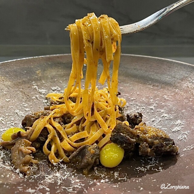 シャモロックの肉とレバーと胡桃のラグーで味わうビーツを練り込まれたタリアテッレ