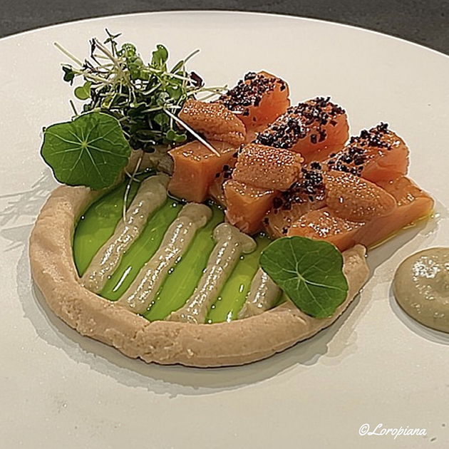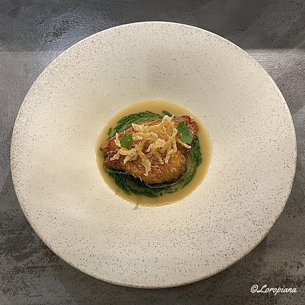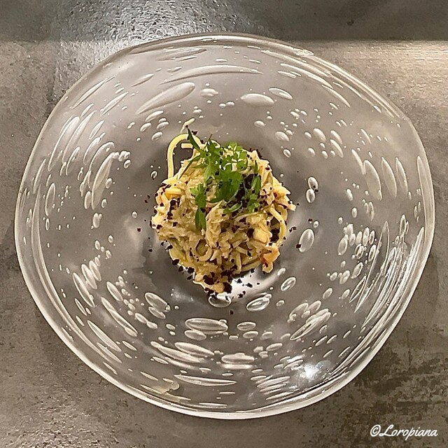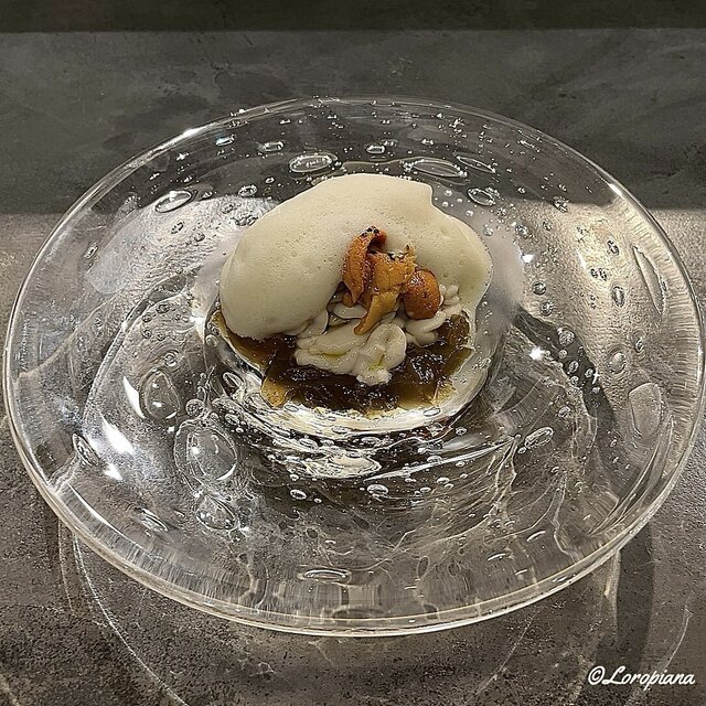 毛蟹のみそのソースと蕗の薹のスキューマ