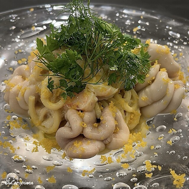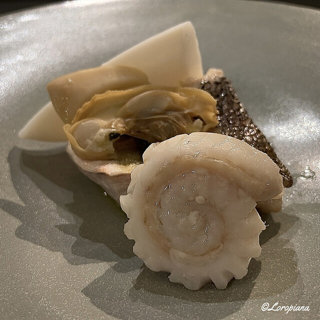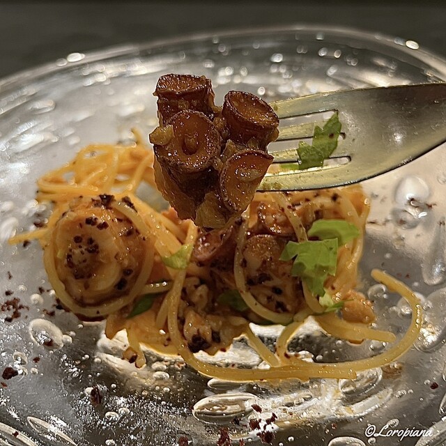 北寄貝と帆立貝、しじみの貝のラグーで味わう青森産のふかひれ