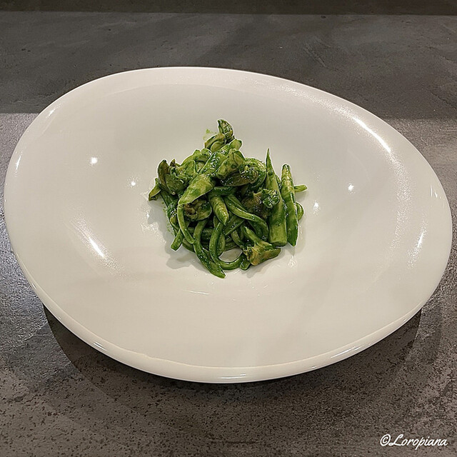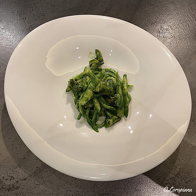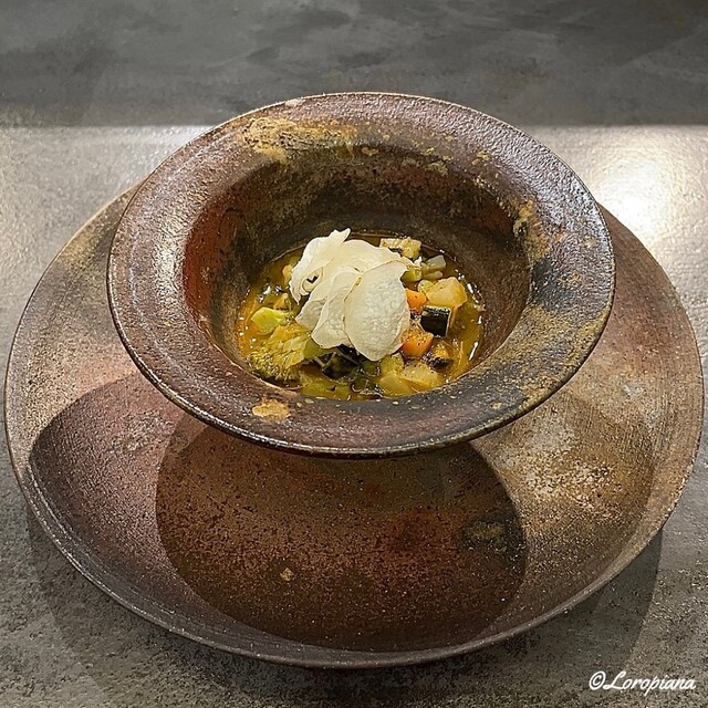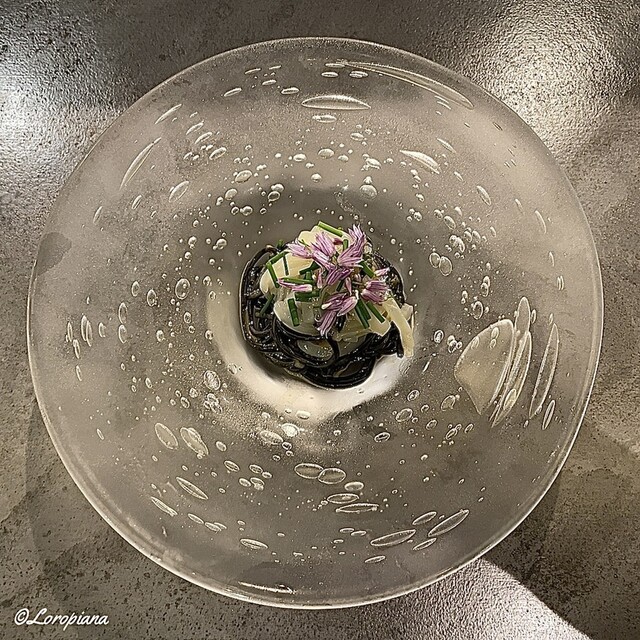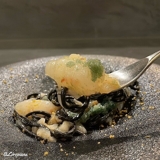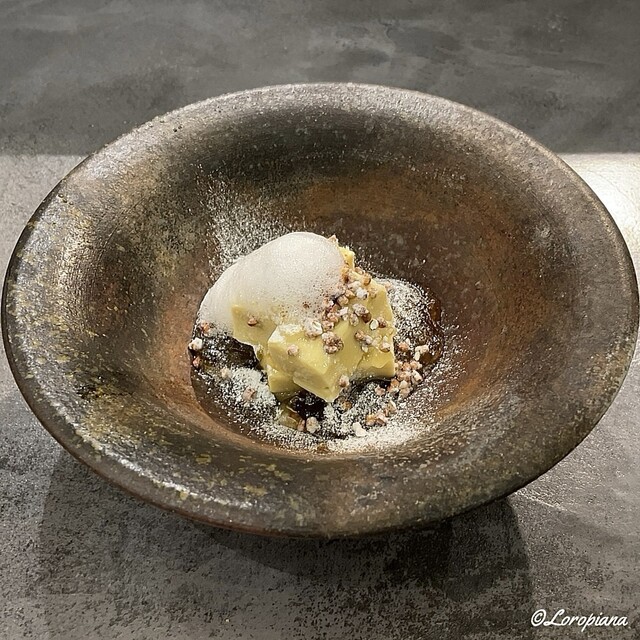 春分の日の休日の前夜は池見良平オーナーシェフとソムリエールでありパティシエールでもある池見悦子マダムが二人三脚で最高のおもてなしで迎えてくれる『Casa del Cibo』さんへ一年ぶりに再訪させていただきました。席はオープンキッチン前のシェフズカウンター席に取らせていただきアペリティーボにはフランチャコルタの24ヶ月熟成された華やかな香りと深みのある味わいの『Monte Rossa Prima Cuvée Franciacorta Brut』を料理はフランス産の『フォワグラ』のテリーナと十和田産ビーツのスフォルマ―トとジャージーミルクのマスカルポーネのエントラータからスタートしアンティバストは多皿構成で前半には八戸産の天然の『松川鰈(マツカワガレイ)』と『槍烏賊(ヤリイカ)』タルタル仕立、すっきりとした辛味の『青唐辛子(アオトウガラシ)』と檸檬(レモン)の香りが心地良い『レモン胡椒(レモンコショウ)』と菊菜(キクナ)のオイルとともに味わう皿と後半にはイタリア産の『ホワイトアスパラ』のボッリート。緑色を帯びた殻に卵黄の割合が30%以上という田子産の『緑の一番星』と呼称される鶏卵(ケイラン)を使った濃厚な卵黄ソースとプロシュットの塩味、仕上げに削り掛けられた見た目も香りも白トリュフに近い稀少な『ビアンケットトリュフ』の香りに包まれ味わいました。今回は変則的にセコンド・ピアットの魚料理のペッシェをズッパとしてアンティパストの次に供された皿は八戸産の赤いダイヤモンドとも称される『喜知次(キチジ)』の焼リゾット≒リゾット・アッラ・ミラネーゼ(Risotto alla milanese)と八戸産の白魚(シロウオ)のフリットに目の前で喜知次(キチジ)の粗や骨や甲殻類から丁寧に抽出された混濁させずに澄んだ金茶色したスープ≒ズッパ・ディ・ペッシェ(Zuppa di Pesce)とともに味わいました。そしてプリモ・ピアットは全三皿で最初に生地に唐辛子(トウガラシ)を練り込んだ冷製タリオリーニを青森産の『甘海老(アマエビ)』とたっぷりと添えられた『生海胆(ナマウニ)』とともに味わい二番目には八戸産の『毛蟹(ケガニ)』と『かにみそ』をリピエーノに使いリピエーノに合わせて生地の厚みを調整し造らけたトルテッリを毛蟹(ケガニ)と甲殻類のビスクと蟹(カニ)が吹いた泡を見立てたセロリのスキューマと仕上げに数られたボッタルガとともに重層的な味わいを満喫させていただき三番目には青森県産の地鶏『シャモロック』の肉とポルチーニセッキのラグーとともに味わう自家製のマッケローニの三皿をいただきました。イタリアには500種類を超えるパスタがあると言われておりますがピエモンテのタリオリーニ、トスカーナのトルテッリ、ナポリのマッケローニとイタリアのパスタの旅を楽しませていただいた後にはメインであるセコンド・ピアットの肉料理のカルネです。奥津軽産の『猪(イノシシ)』のアッロースト。猪(イノシシ)のロースを猪(イノシシ)のバラ肉で巻き焼いたものをドルチェフォルトとキャラメルのソースで味わいます。コントルノには牛蒡(ゴボウ)と自然薯(ジネンジョ)とビーツの花と五味五感と味蕾を刺激する池見シェフ渾身のひと皿です。ドルチェはパティシエールでもある悦子マダムの手によって造られた十和田産の韃靼(ダッタン)そば茶のパンナコッタとジュレ 蕎麦(ソバ)の実(ミ)のクロッカンテをエスプレッソとともにいただきました。ディジェスティーボに『Sibona Grappa Riserva Botti da Sherry』をいただきました。日本人が選ぶ世界の人々のための日本のレストラン10軒『Destination Restaurants 2023』にGault&Millau(ゴ・エ・ミ・ヨ)やTabelog Award Bronzeに百名店、同業のシェフが選ぶヒトサラBestChef&Restaurant等々、日本国内はもとより世界からもら注目される『Casa del Cibo』さん。池見シェフの真のリストランテ料理と悦子マダムの料理にぴたりと寄り添う絶妙なペアリングワインで満たされた至福で口福な時間に感謝です。
