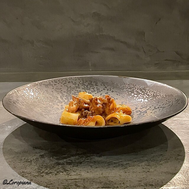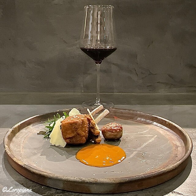 Masi Campofiorinと羊肉をリピエノとして使ったクルルジョネスをペコリーノとパプリカのソース