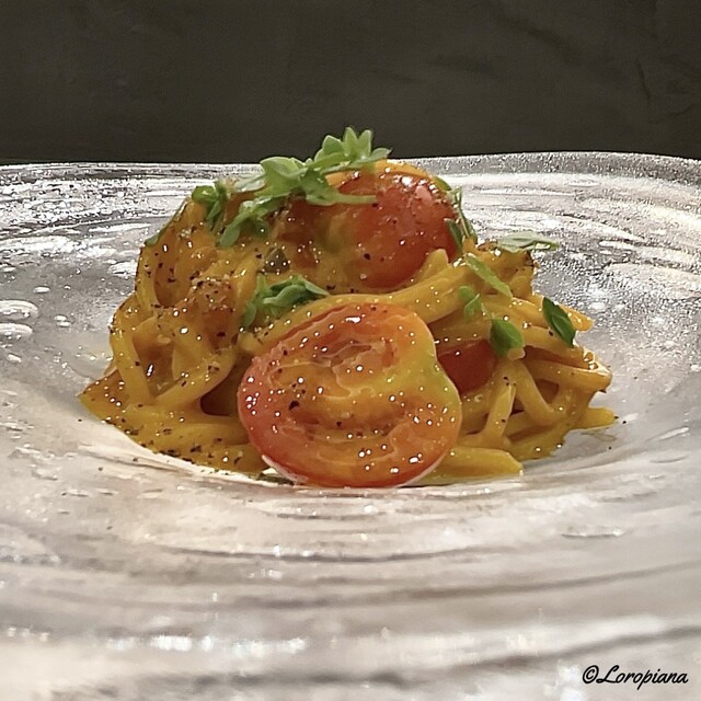 甘海老と生海胆と唐辛子を練り込んだ冷製タリオリーニ