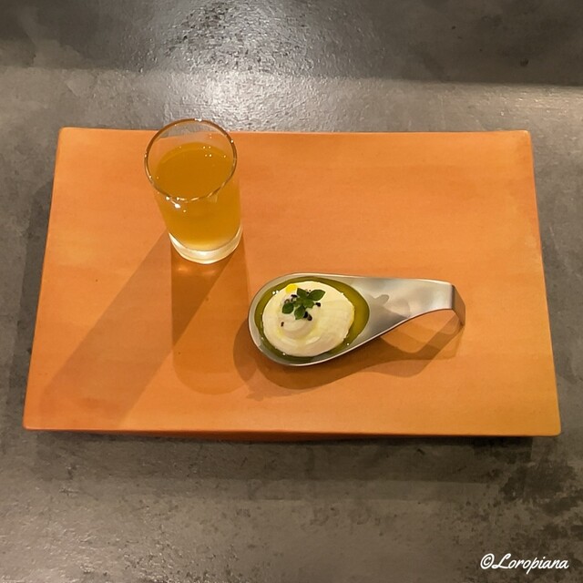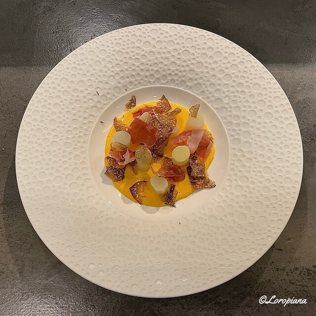 イタリア産のホワイトアスパラのムニャイヤと緑色を帯びた殻に卵黄の割合が30%以上という田子産の緑の一番星と呼称される鶏卵(ケイラン)を使ったウ・ポシェとフォンドゥータ