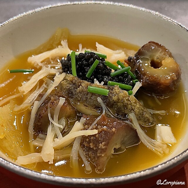 喜知次の鱗焼と大きな天然滑子のスーゴ仕立て