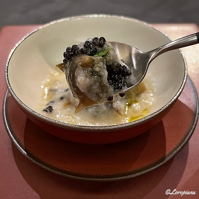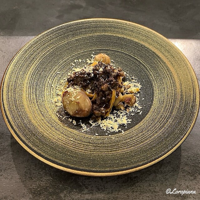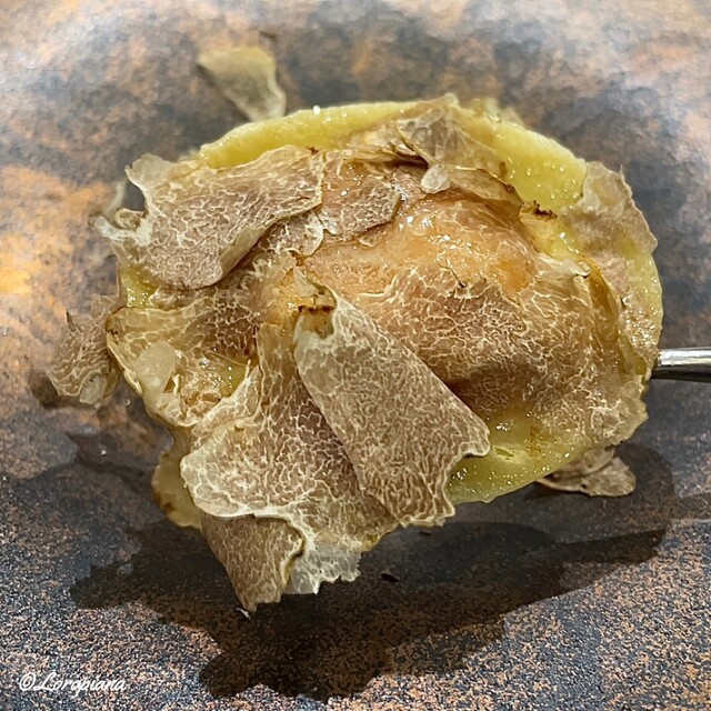 ハナキンの金曜日の夜は盛岡を離れ八戸へ。そして向かった先は池見良平オーナーシェフとSommelièreでありPâtissièreでもある池見悦子マダムが二人三脚で営まれる北は北海道、南は九州・沖縄と全国から数多の客が挙って訪れる北日本を代表する口福リストランテ『Casa del Cibo』さんです。全席満席の中、いつものカウンター席に席を取らせていただきアペリティーヴォには輝く黄金色に強く立ち上る泡のシャンパーニュ ゴッセ社の『Gosset Extra Brut』を料理は超希少な八戸産の『灯台つぶ』とアスパラガスチコリーとも称されるエミューズファーム産さんのプンタレッラのトリフォラータのエントラータからスタート。嚙み込んだ歯を押し返すような弾力と咀嚼感が楽しめる螺貝(ツブガイ)とチコリ特有の爽やかな苦みとカリカリとした食感が同時に楽しめる一皿から。プンタレッラは国産もので過食部分が多いことから丸ごといただきましたが本場イタリアの方が画像だけ見られたらきっと驚かれることでしょう。アンティパストは全三皿で一皿目には年末年始には八戸や盛岡等 旧南部藩エリアでは食卓に欠かすことが出来ぬという『滑太鰈(ナメタガレイ)』とインカのめざめのテリーナ。たっぷり添えられたイタリア産の『キャビア』と白花豆のソースとともに味わうひと皿。ナメタ鰈はフランス料理で言えばミ・キュイ仕立てイタリア語に置き換えるとプレコットでしょうか?絶妙な火入れ加減でした。二皿目には池見シェフの友人が罠捕りした茨城県産の天然『真鴨(マガモ)』のレバーのパテと八戸産の菊芋(キクイモ)のスフォルマート。レバーパテの滋味深い味わいは天然の真鴨(マガモ)ならではのもの。そして三皿目には12月~漁が解禁となった三沢産の『北寄貝(ホッキガイ)』に陸奥湾産の『帆立貝(ホタテガイ)』に十三湖産の『しじみ』の青森県産の貝のラグーとともに味わう青森産の『フカヒレ』のひと皿。中国料理のフカヒレ料理をリスペクトして造られた贅沢な皿の余韻に暫し浸ります。ナメタ鰈のプレコットにはピエモンテ州の『Le Rive Gavi del Comune di Gavi』を真鴨(マガモ)のレバーパテにはアルザスの『Domaine Roland Schmit Alsace Gewurztraminer Glintzberg』、フカヒレと貝類の皿にはブルゴーニュの『La Chablisienne Chablis 1er Cru Vaillons』とのアッビナメントを愉しませていただきました。プリモ・ピアットも多皿構成で前半には八戸産の『真鱈(マダラ)』の『白子(シラコ)』≒『くもこ』と昨日、店に届いたばかりのイタリア産の『オータムトリュフ』≒『黒トリュフ』を仕上げに惜しげもなくたっぷりと削り掛けられたノルチャ風のスパゲティと茨城県産の天然『真鴨(マガモ)』のラグーと大粒の銀杏(ギンナン)を使ったタヤリンの二皿です。届けられたばかりの『黒トリュフ』は香りの濃度が別物です。今年は『白トリュフ』は昨年より20㌫割程安価と聞き及んでおりますが反対に『黒トリュフ』は三割程高値の模様です。そんなトリュフを手にした池見シェフも穏やかな表情を浮かべられていました。トリュフの香りに包まれた『くもこのパスタ』にはバニラ香と木樽の熟成香とフレッシュな果実味が見事なウンブリア州の『Goretti Il Moggio』、真鴨(マガモ)のラグーには鴨(カモ)の肉の他にハツやレバー等の内臓も使われており野趣味溢れる味わい。ジビエ感満載の真鴨(マガモ)のパスタにはピエモンテ州の『Duca Bortini di Montebello Barbaresco Riserva』とともにいただきセコンド・ピアットの魚料理のペッシェには八戸産の肉厚の活穴子(カツアナゴ)を使った日本料理の『白焼(シラヤキ)』にも相通じる『穴子(アナゴ)』のインパデッラと十和田産の牛蒡(ゴボウ)のコンフィと牛蒡(ゴボウ)の細切りチップスを自家製の実山椒(ミザンショウ)とともに味わう皿と肉料理のカルネには茨城県産の罠捕りの天然『真鴨(マガモ)』の小鴨(コガモ)の胸肉のアッローストとモモ肉のコンフィを黒にんにくのソースとともに味わいます。コントルノにはジビエの味わいに寄り添うエミーズファーム産さんの『セルリラック』≒ 根セロリとリンゴのグラティナート。穴子のインパデッラにはヴェネト州の『L'Arco Rosso del Veronese』を真鴨のアッローストにはローヌのシラー『François Villard Saint Joseph Reflet』とともにいただきました。そしてドルチェには悦子マダムの手により造られた弘前産のカルヴイルブランの低温マリネとレモンクリームタルトのヴァニラジェラート添え、カッフェにエスプレッソダブルで〆られた魂を込めて作られた池見シェフの真のリストランテ料理と悦子マダムによるワインのペアリングで最高の時間を愉しませていただいた師走12月の口福な時間に感謝。美味しい料理は器も盛付けもとても美しく心血注ぎ作られた料理は食べ手に感動を与えるものです。