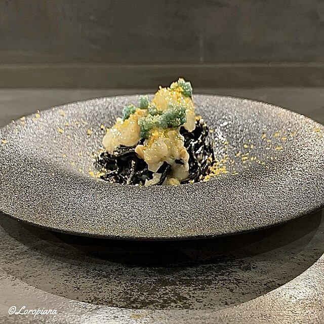 鮑の肝を練り込んだタリオリーニに鮑とキャビアの冷製パスタ