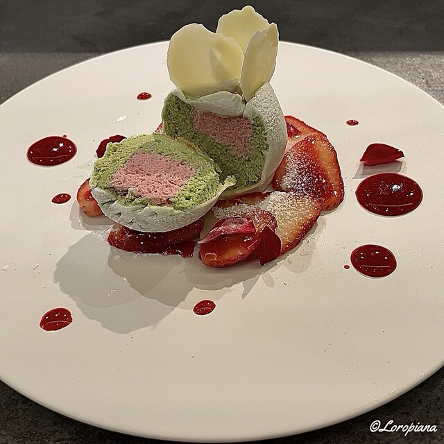 紅ほっぺイチゴのマリネとピスタチオのメレンゲとマスカルポーネの二種のジェラート