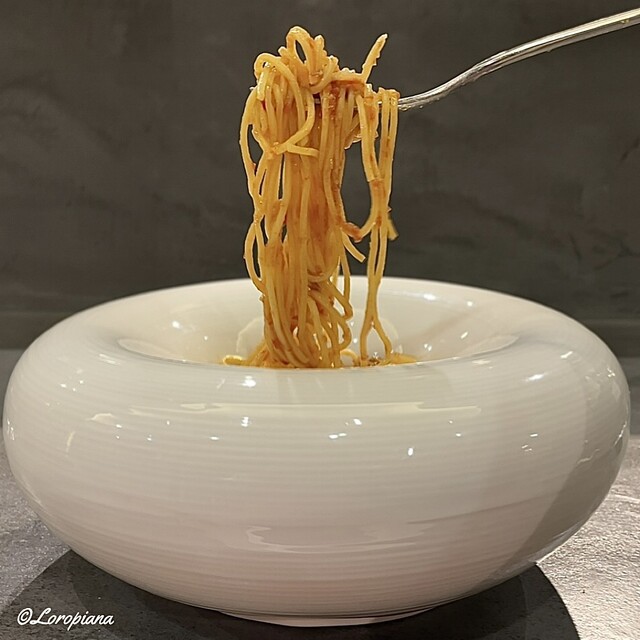 生地に唐辛子を練り込んだ冷製タリオリーニ
