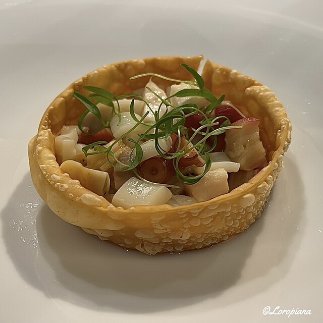 松川鰈と槍烏賊のタルタル 菊菜のオイルとレモン胡椒