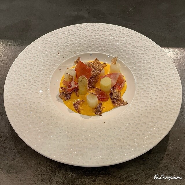 イタリア産ホワイトアスパラのムニャイヤと田子産の鶏卵のウ・ポシェとフォンドゥータ