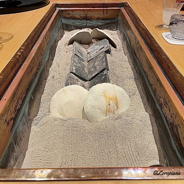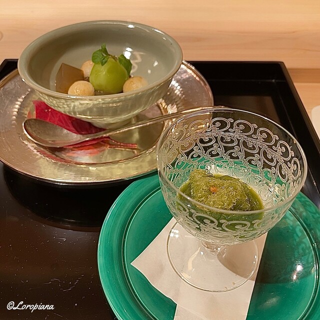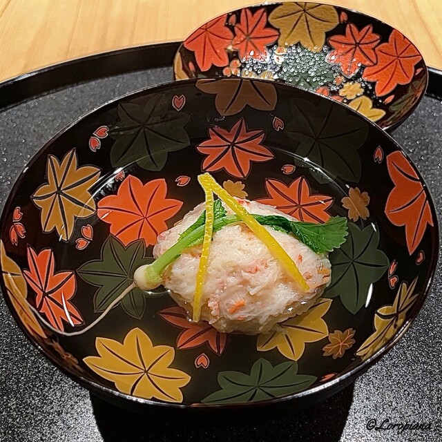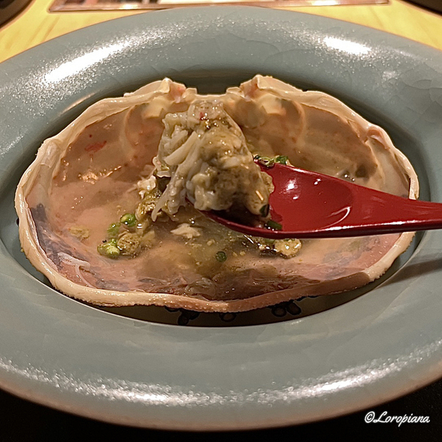 十年の時を経て原点回帰 唯一無二の料亭として完全予約制にて満を持して営業を再開された五十嵐 公亭主と女将さんの五十嵐絹枝さんが二人三脚で腕を揮われる並木の『らん亭』さん。多くの方は『らん亭』さんと言えば『らん亭 美日庵』さんを思い浮かべられる方が多くいらっしゃると思いますが並木の『らん亭』さんこそが本来の料亭『らん亭』さんとなります。當日は営業再開二日目で食べ物好きの面々と四人で利用させていただきました。看板等は一切なく正にオトナの隠れ家的な店構え。提灯の灯りに導かれ格子戸をくぐり苔がびっしりと生えたアプローチほ経て奥にある店内へと足を進めます。個室の掘り炬燵式のテーブル席に腰を下ろします。丁寧に手入れが施された中庭の風情。時折カコーンという、ししおどしの音が風流で情感をかきたてます。其々の席に着き先ずは『Fleury Fleur de l'Europe Brut』で再会を祝し乾杯。料理は香住産の『香箱がに』のカニ酢ジュレ掛けの先付からスタート。そして八寸代わりの旬菜二品には西葫芦(ズッキーニ)の胡桃(クルミ)白和えにとら河豚(フグ)の煮凝り(ニコゴリ)、料理人腕の見せどころの椀物には『間人(タイザ)がに』を使った贅沢な『蟹真薯(カニシンジョウ)』の椀種に芽蕪(メカブラ)と吸口に松葉柚子(マツバユズ)、昆布出汁(コブダシ)と鮪節(マグロブシ)を使い引かれた上品な吸い地は食べ終えることに味のトーンが山場を迎える滋味優先の京の都のソレに匹敵する淡い清汁仕立。向付にはたっぷりの鴨頭葱(コウトウネギ)と紅葉卸(モミジオロシ)で覆われた天然『とら河豚(フグ)のテッサと生の『河豚(フグ)の白子(シラコ)』。別皿の鴨頭葱(コウトウネギ)が放たれたポン酢と紅葉卸(モミジ)と生の河豚(フグ)の白子(シラコ)を潰し混ぜ和え『河豚(フグ)』のぶつねりスタイルで一度で二度の異なる味で愉しませていただきました。炊合せには真鱈(マダラ)の雲子(クモコ)を炭火で焼き表面を炙ったものと素揚げにした海老芋(エビイモ)、そして焼物には京都から届けられた幻の『間人(タイザ)がに』を目の前の囲炉裏に焼網を架けその上で焼かれる『唐墨餅(カラスミモチ)』と『焼がに』。更には間人(タイザ)がにの『かにみそ』とほぐした蟹の身の『甲羅焼(コウラヤキ)』で活蟹の味を余すところなく味わい場所を隣の部屋に設けられたカウンター席に席を移して五十嵐大将の御実家の家業であった江戸前鮨の実演です。肉厚で活かった身質の『鮃(ヒラメ)』からはじまり脂の旨味が凝縮した『鮃(ヒラメ)』の『縁側(エンガワ)』、噛んだ歯を押し返すような弾力が愉しめる『とら河豚(フグ)』、白板昆布で表面を覆った宮城の1㌔超のブランド鯖『金華鯖(キンカサバ)』を使った『鯖(サバ)』の松前(マツマエ)に『〆鯖(シメサバ)』、大間産の一本釣りの天然『本鮪(ホンマグロ)』の赤身のづけ二連発の後に砂ずりの大トロ、そして香り高き有明産の青飛びの焼海苔(ヤキノリ)にたっぷりの『海胆(ウニ)』、更には大間産の『本鮪(ホンマグロ)』の赤身のづけをこれでもか!と言わんばかりに使われた超贅沢な太巻の鉄火巻(テッカマキ)をいただき〆は活けの『伊勢海老(イセエビ)』の炊込みごはん、そして水菓子と贅を尽くした空間にて最高の食事の時間を存分に楽しませていただきました。當夜は『らん亭』さんの営業再開にあたり六本木ヒルズの茶寮『宮坂』さんにて料理長を務められている五十嵐庄大朗さんも急遽駆けつけてくださり料理に合せてペアリングをしてくださるサプライズもあり夢の様な口福な時間を過ごさせていただきました。