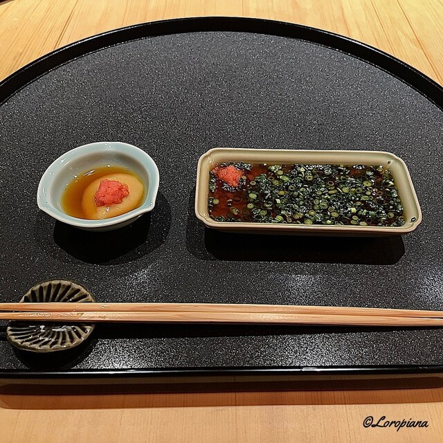 河豚の白子に紅葉卸にポン酢、鴨頭葱とポン酢