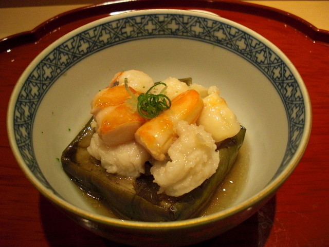 鱧が脇役に徹した加茂茄子の煮浸し鱧と海老のそぼろあん。