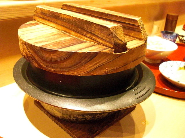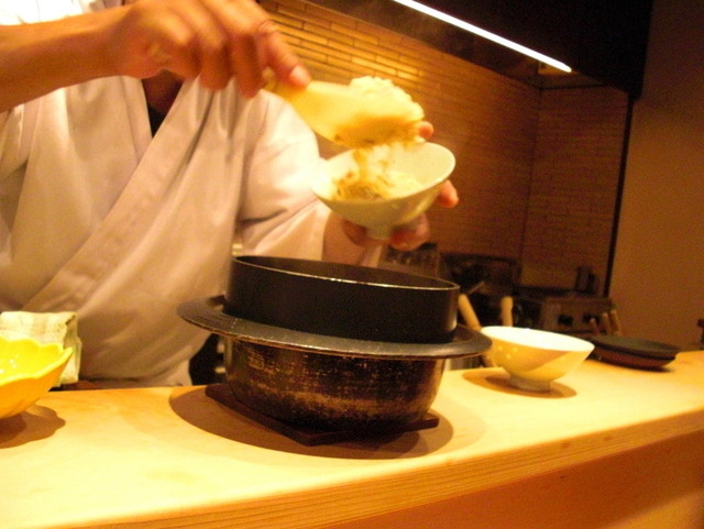 鱧出汁を使い釜で炊きあげられた焼鱧の炊き込みご飯 は店主 酒井ゆたか氏が