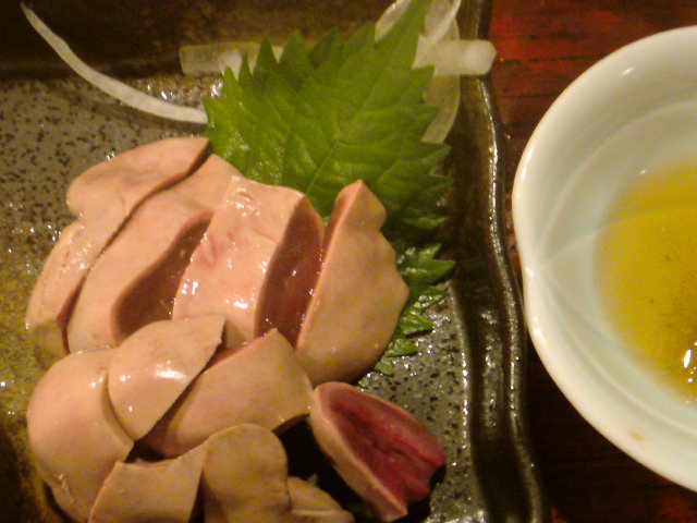 新鮮な鳥レバーの刺身。ニンニク醤油、生姜醤油、塩胡麻油でいただきます。