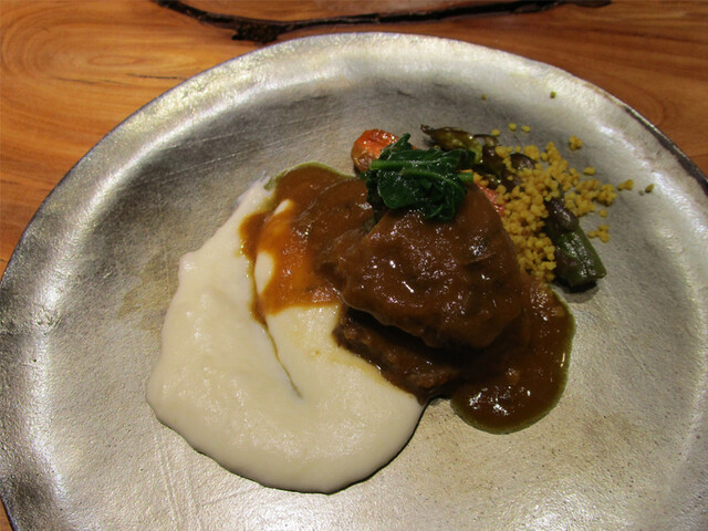 夏野菜と鯖の煮込みは所謂ラタトゥイユというやつですね。この手の鯖は生臭さが残りそうなものですが、臭みが一切ないですね。野菜との相性も抜群。