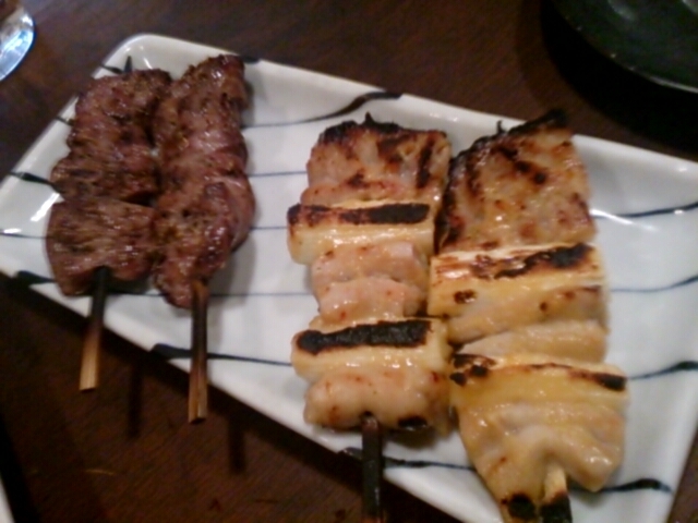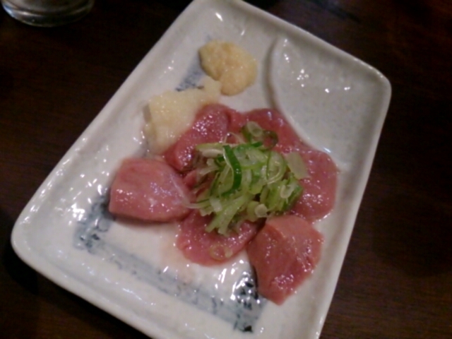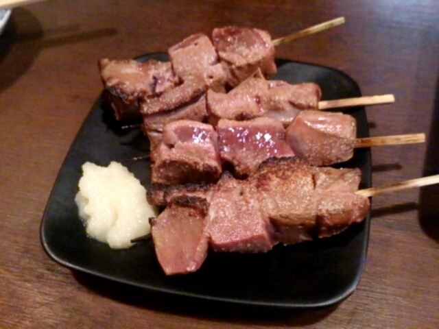 中がレアなレバー焼きですが、にんにくやしょうがを豪快に付けて食べます。