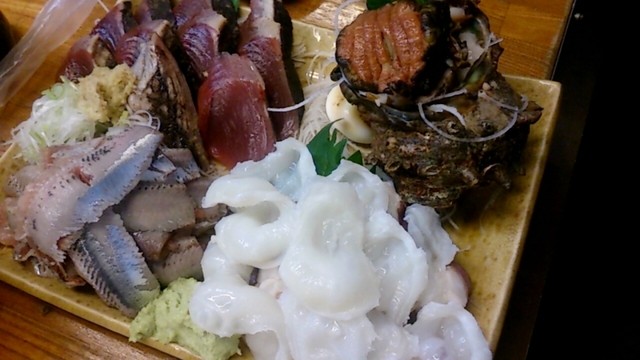 いわし、かつを塩たたき、たこ、サザエをお願いしましたがすんごい山盛りです!